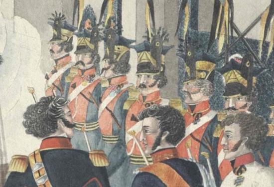 - poddůstojníci Schwarzenbergova hulánského pluku (kteří byli toho času posádkou v Opavě) držící v pravé ruce svíce.