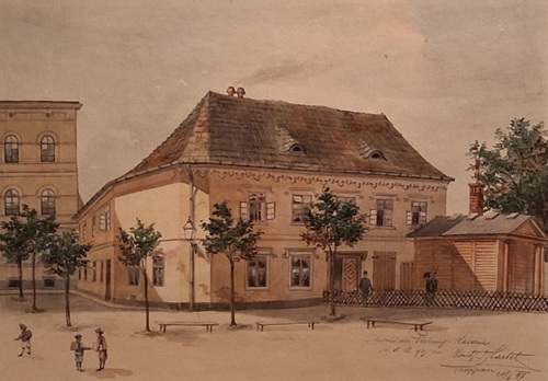 Moritz Hartel: Kasárna na Rybím / Smolném trhu (Pechring-Kaserne) na akvarelu z roku 1897,